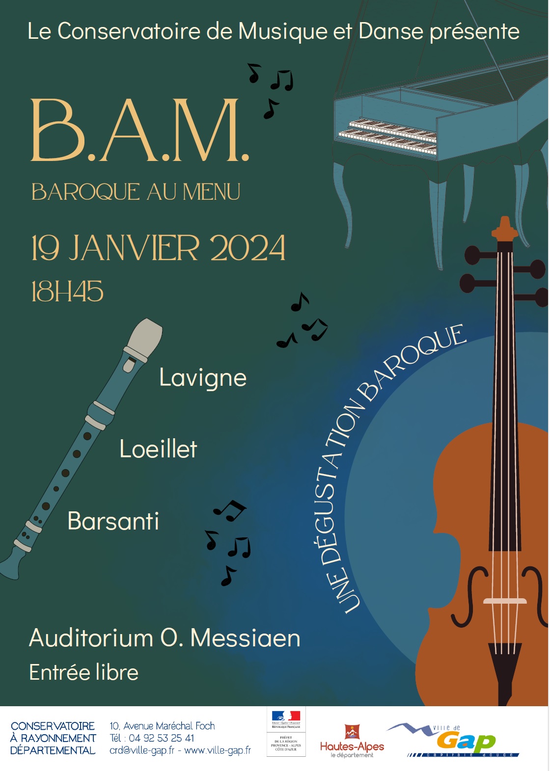 Vendredi 19 Janvier à 18h45 : Baroque au Menu, Conservatoire de Musique et de Danse, 10 avenue Maréchal Foch, 05000 Gap