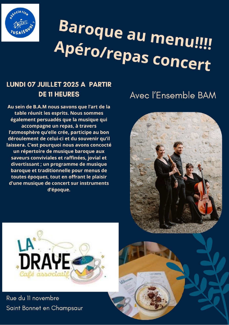 - Lundi 7 juillet à 11h : Baroque au Menu, au café associatifs, 2 rue du 11 novembre 05500 Saint-Bonnet-En-Champsaur